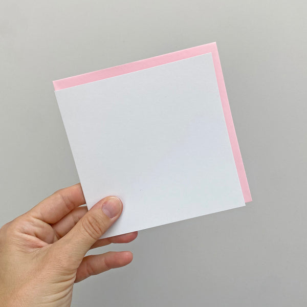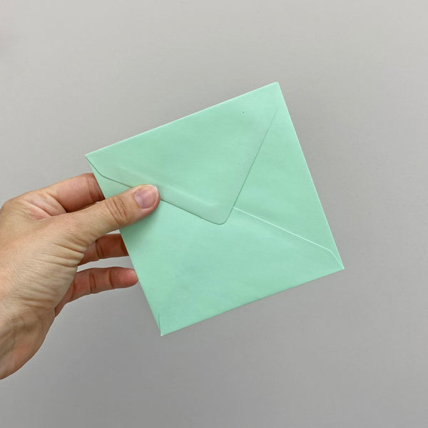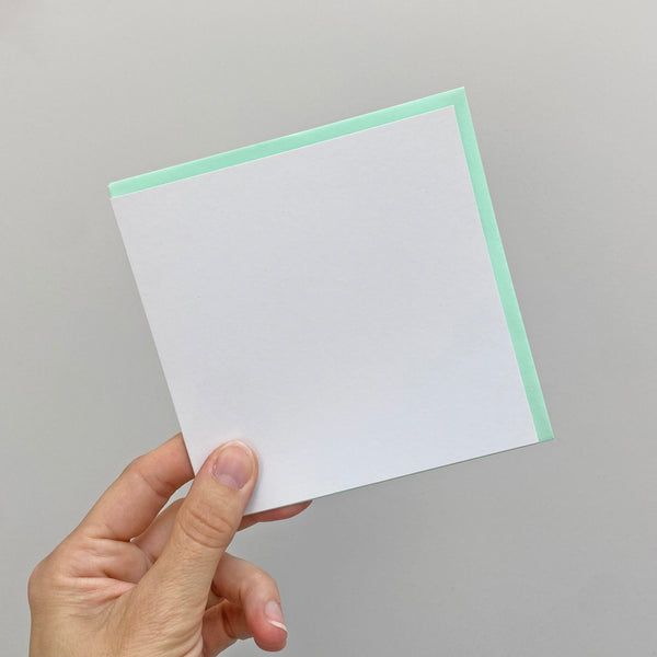 A set of 12 blank cards with mint and pink envelopes. There are 12 blank cards in the set, 6 mint envelopes and 6 pink envelopes.
