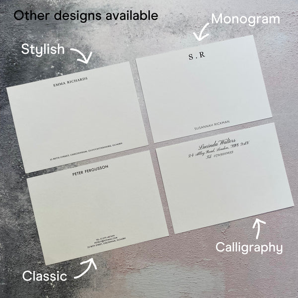 The designs are printed onto luxury 300gsm paper which is FSC certified and made in the Lake district. The correspondence cards come with kraft fleck envelopes as standard or you can upgrade to luxury white envelopes which perfectly colour match the notecards.