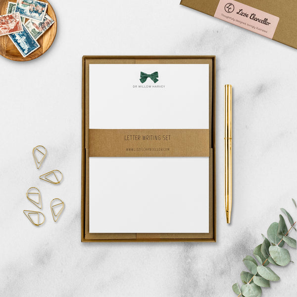 This green velvet bow letter writing set is personalised with the recipients name at the top of the paper and address at the bottom. If you'd like something different - do get in touch, I'm always happy to help.